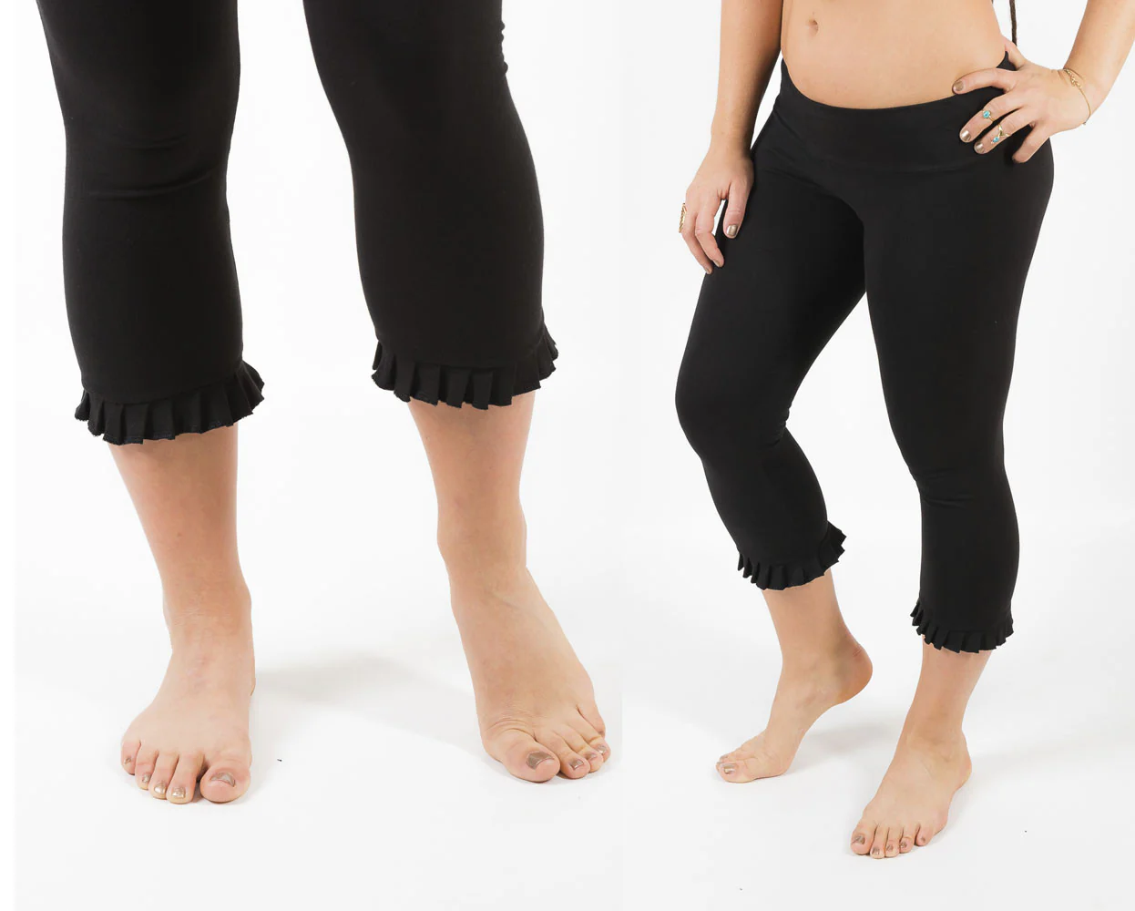 3/4 length crop leggings perfect for festivals and yoga. With a wide waist band for extra support, these yoga tights are super comfortable and stretchy. A cute frill detail at the bottom. Great for layering up for a pixie hippy style.