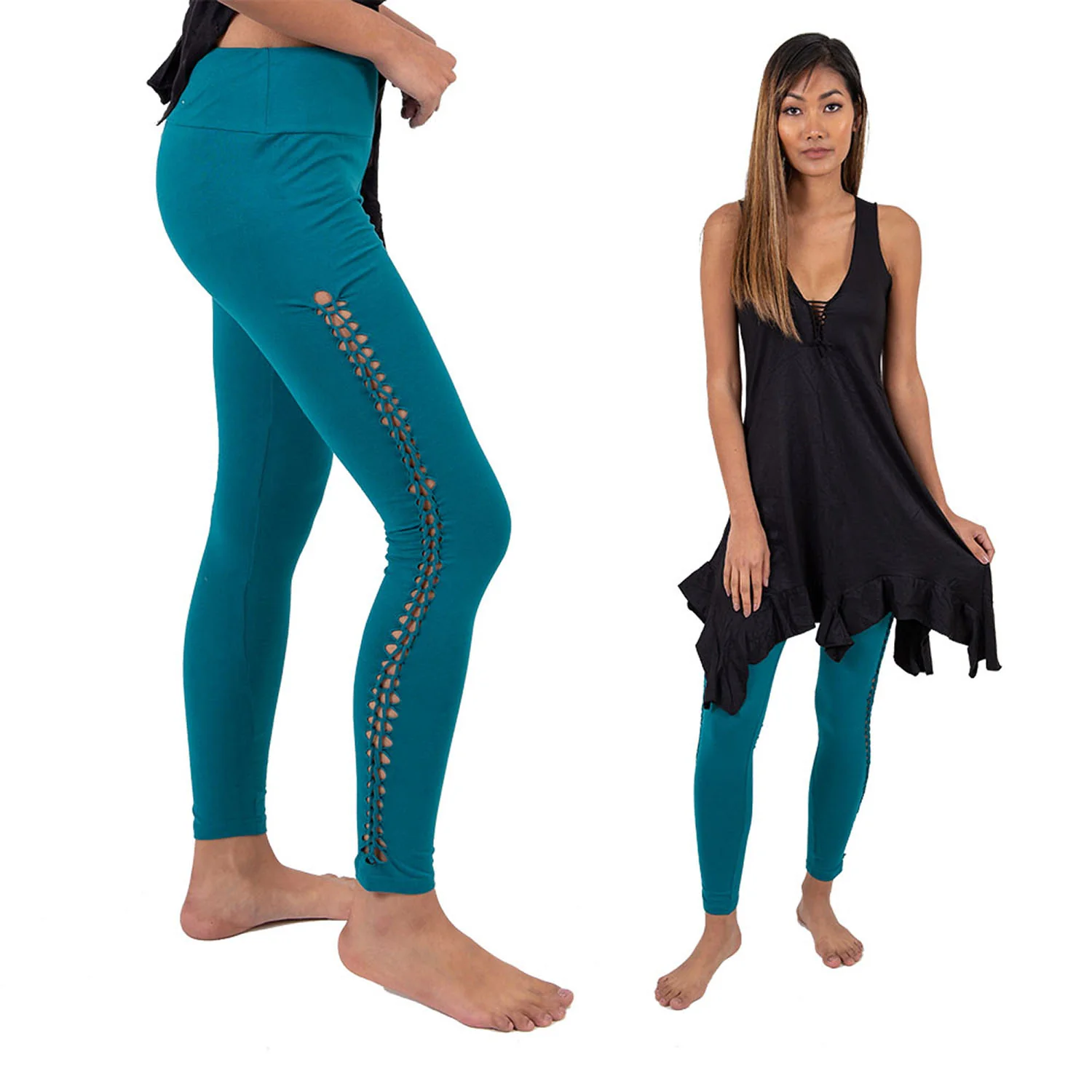 Great leggings for hula hooping, dance, festivals, yoga wear and every day. Soft breathable fabric. Feel the breeze on our legs where it is braided to stay cool.