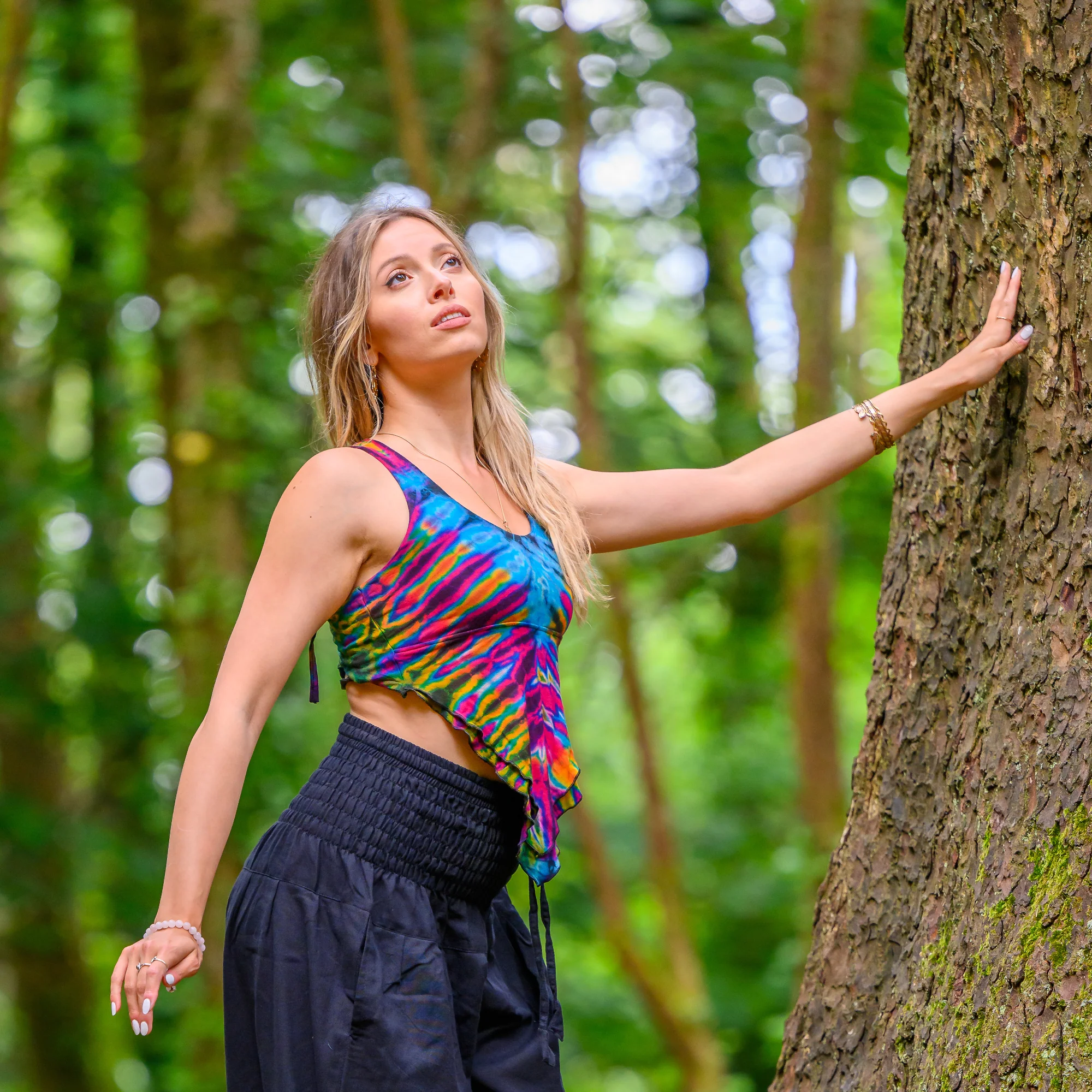 Channel your inner forest pixie with our tie-dye top. The pointy top and lace-up back create a magical, corset-style look, perfect for fairy outfits and hippie wear. The colorful, retro design adds a touch of whimsy to any outfit.
