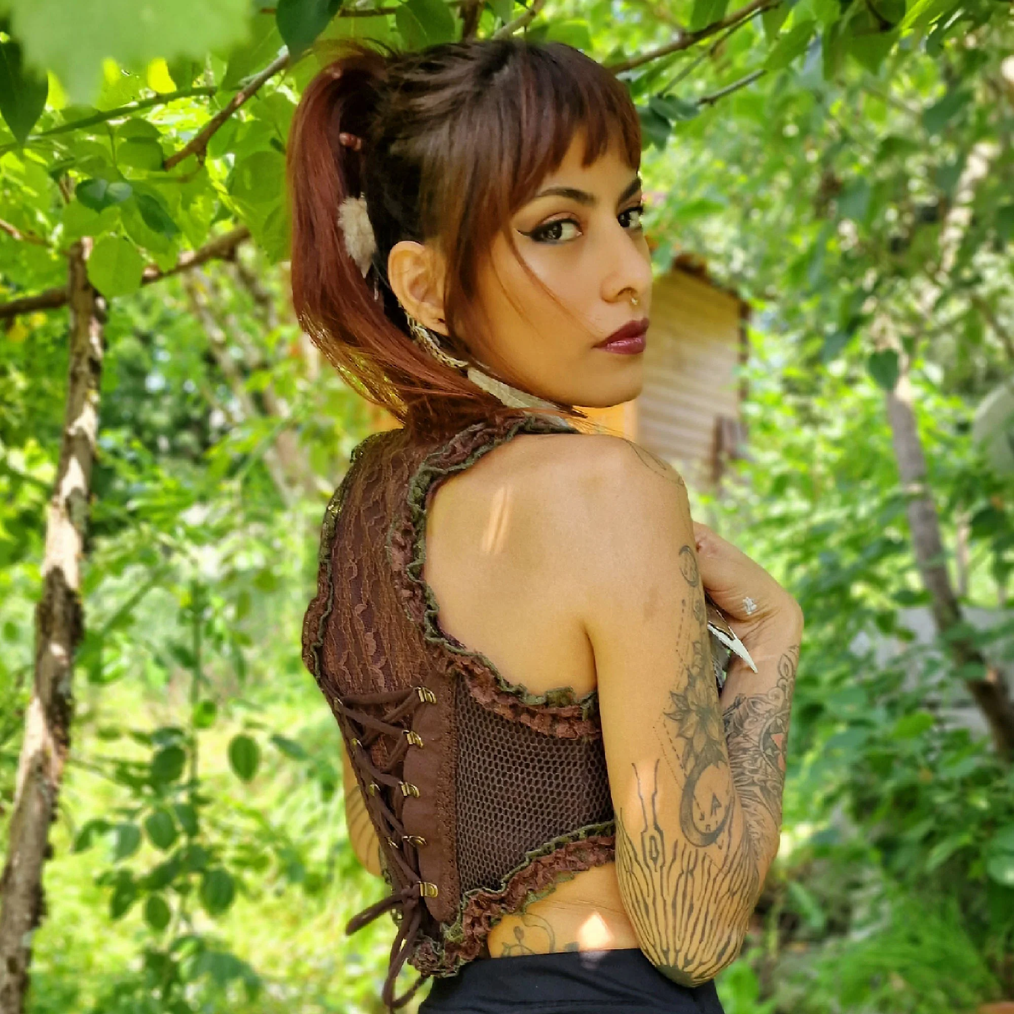 This sexy womens waistcoat is the perfect festival vest for summer. With frilly lacy edges, crochet, brass rivets and a steampunk style corset back, it is made with a super soft and comfy stretchy cotton. Can be worn on it's own or layered with other tops and left open.