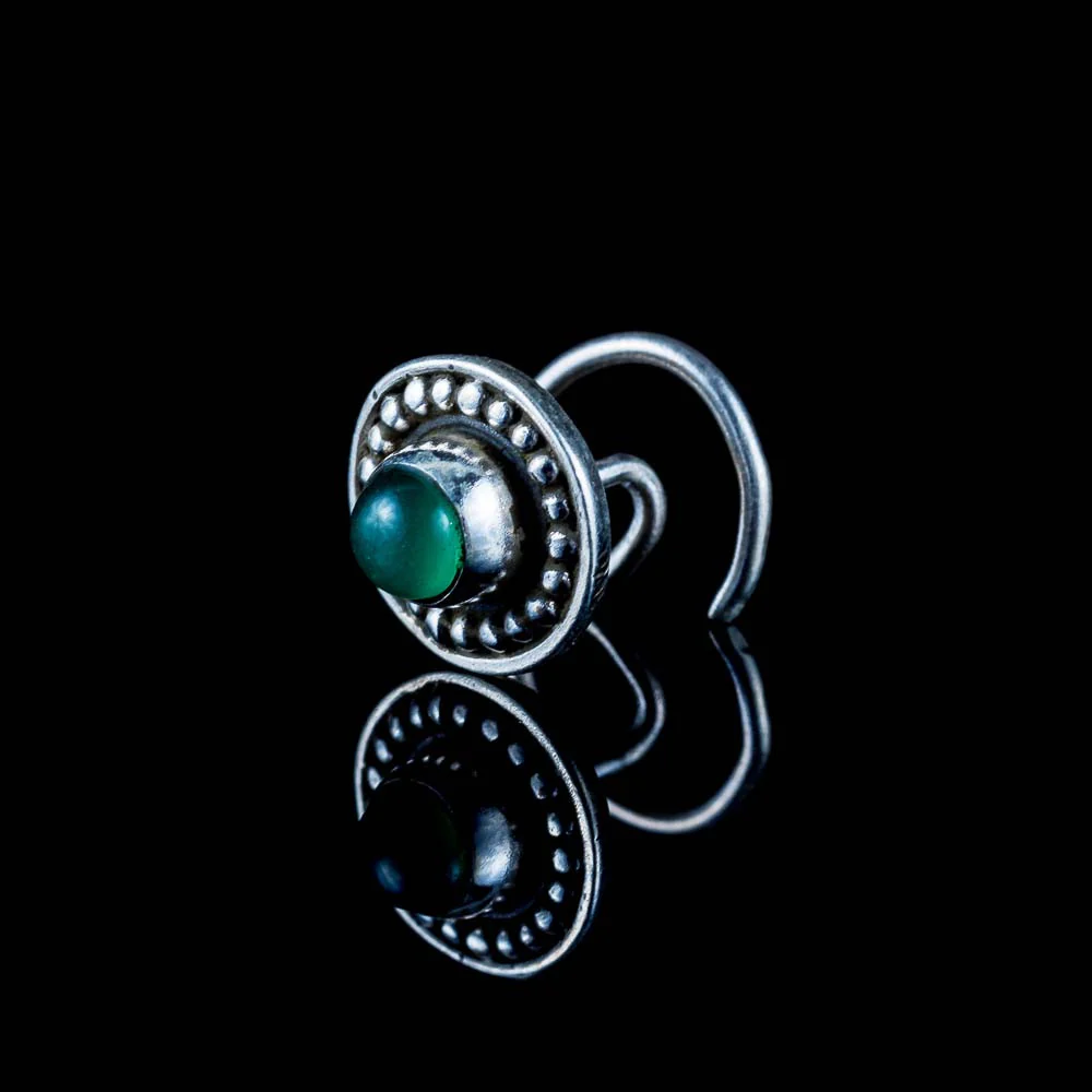 Indian tribal design nose stud with green aventurine gemstone inlay.