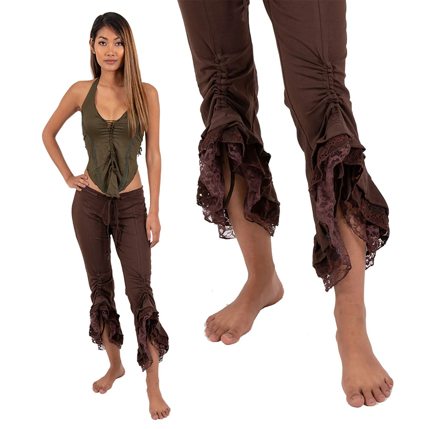 Comfortable and stretchy leggings with steampunk style detailing on the bottom hem - pull up strings which you can tie for en extra ruched look and a triple layer ruffle frill including a final layer of lace! They also have a super long tie up string around the waistband for extra dangly detail.