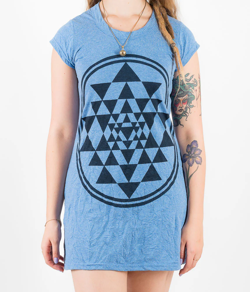 Sri Yantra sacred geometry printed tunic / t-shirt dress. This is a great piece for a casual boho chic style, sexy worn as a short dress, or you can layer it up with leggings or jeans. Soft and breathable fabric, this top / dress is great for yoga, movement and letting go on the dance floor at your favourite music festivals.