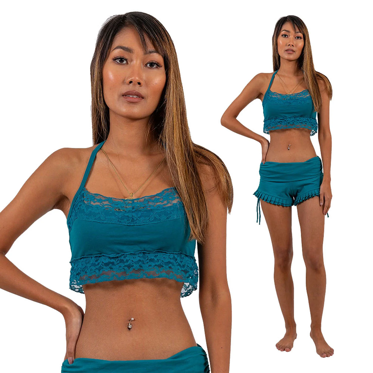 It's a halter neck with lovely lace edge detailing. Perfect yoga wear, dance wear, aerial or hula hoop costume, beach wear, festival wear.