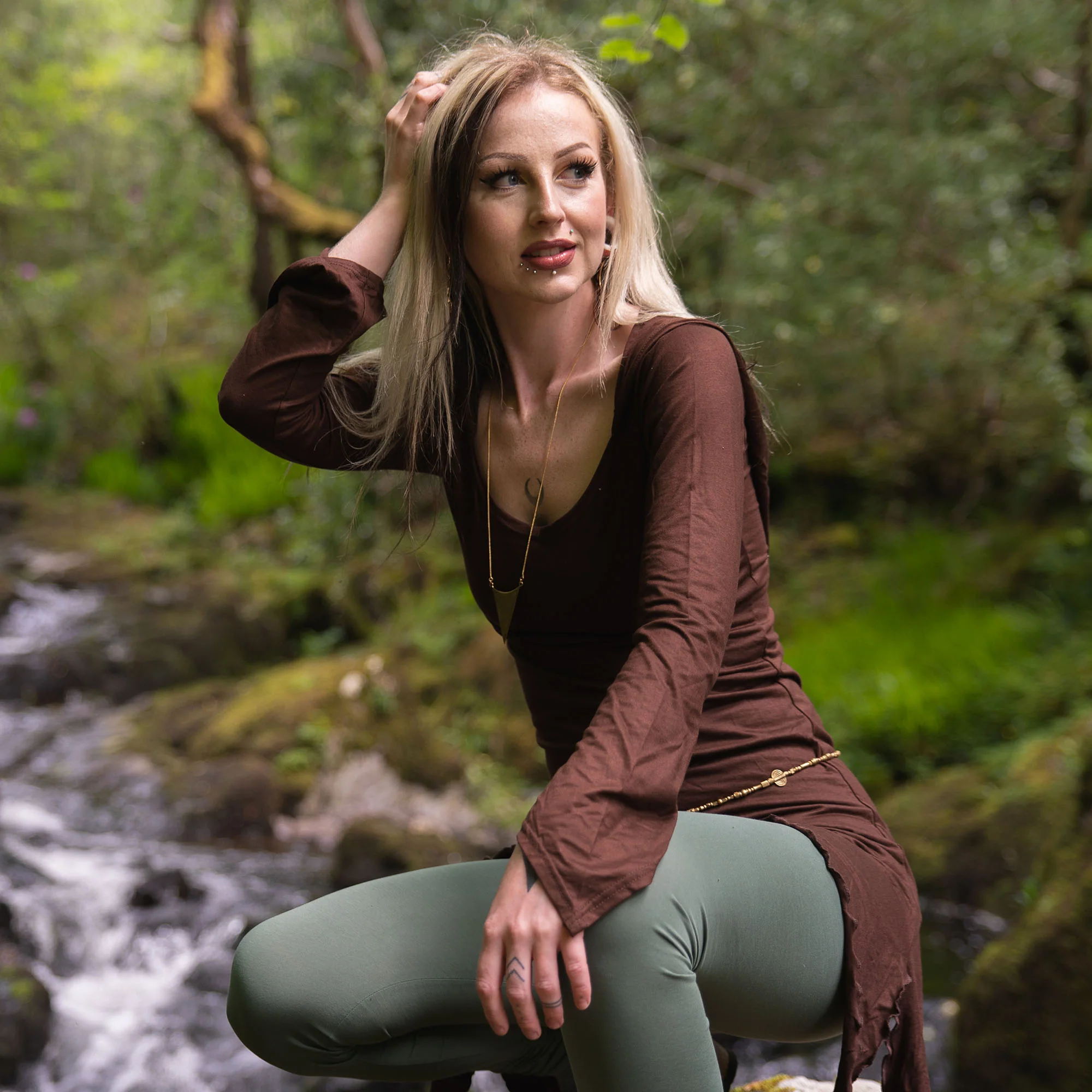 Beautiful fall season pixie dress with long pointed pieces on the sides and a lovely roomy pointed pixie hood. The sleeves have a beautiful pointed detail for an elven feel. Great for layering up and staying warm in the cooler moments at festivals.
