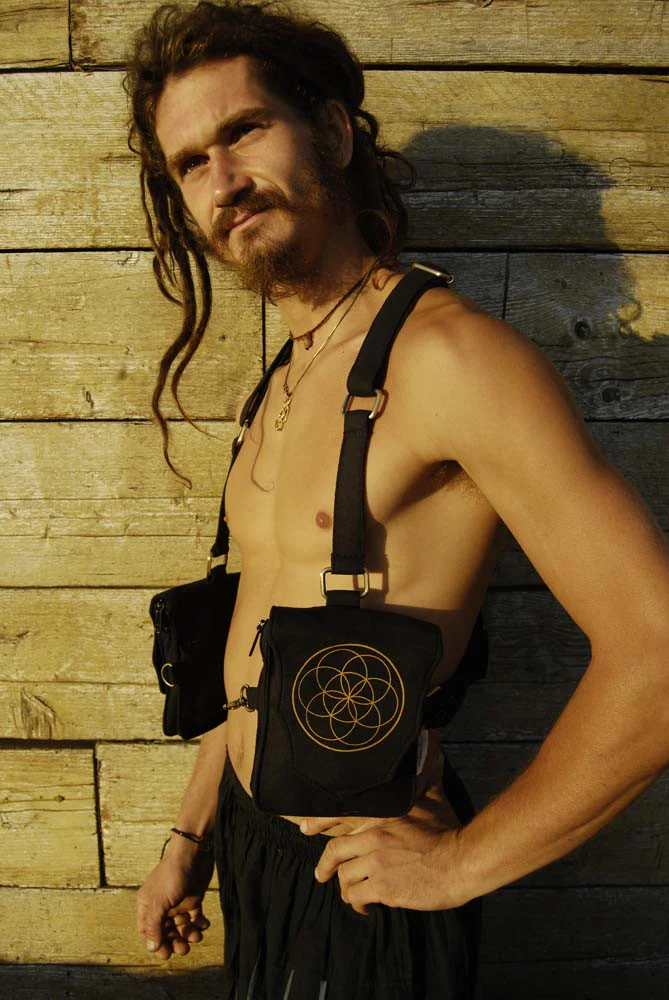 The absolutely essential festival holster bag to top off your Burning Man costume. Wears like a waist coat or vest, this utility pouch has big pockets, a beautiful flower of life grommet in the back and seed of life print on the pockets. Being canvas, it's a vegan version of the leather holster vests, and lighter to wear.