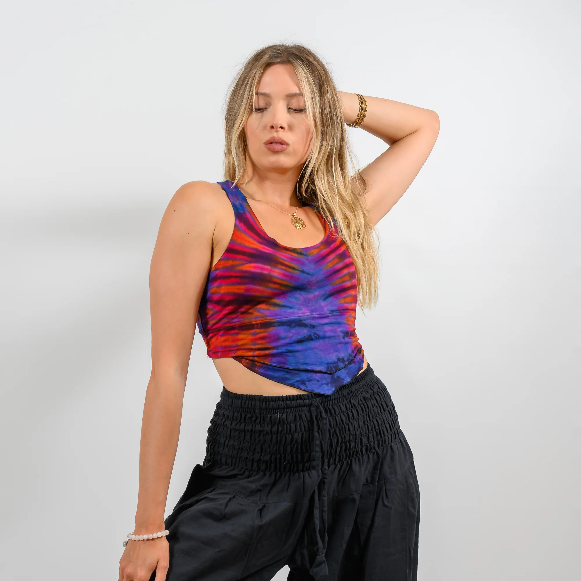 Embrace the celestial beauty of the Selene Tie-Dye Crop Top. This retro hippy design, combined with the lace-up back, creates a sexy and bohemian look. Perfect for festivals or casual outings, this belly top is both comfortable and stylish.