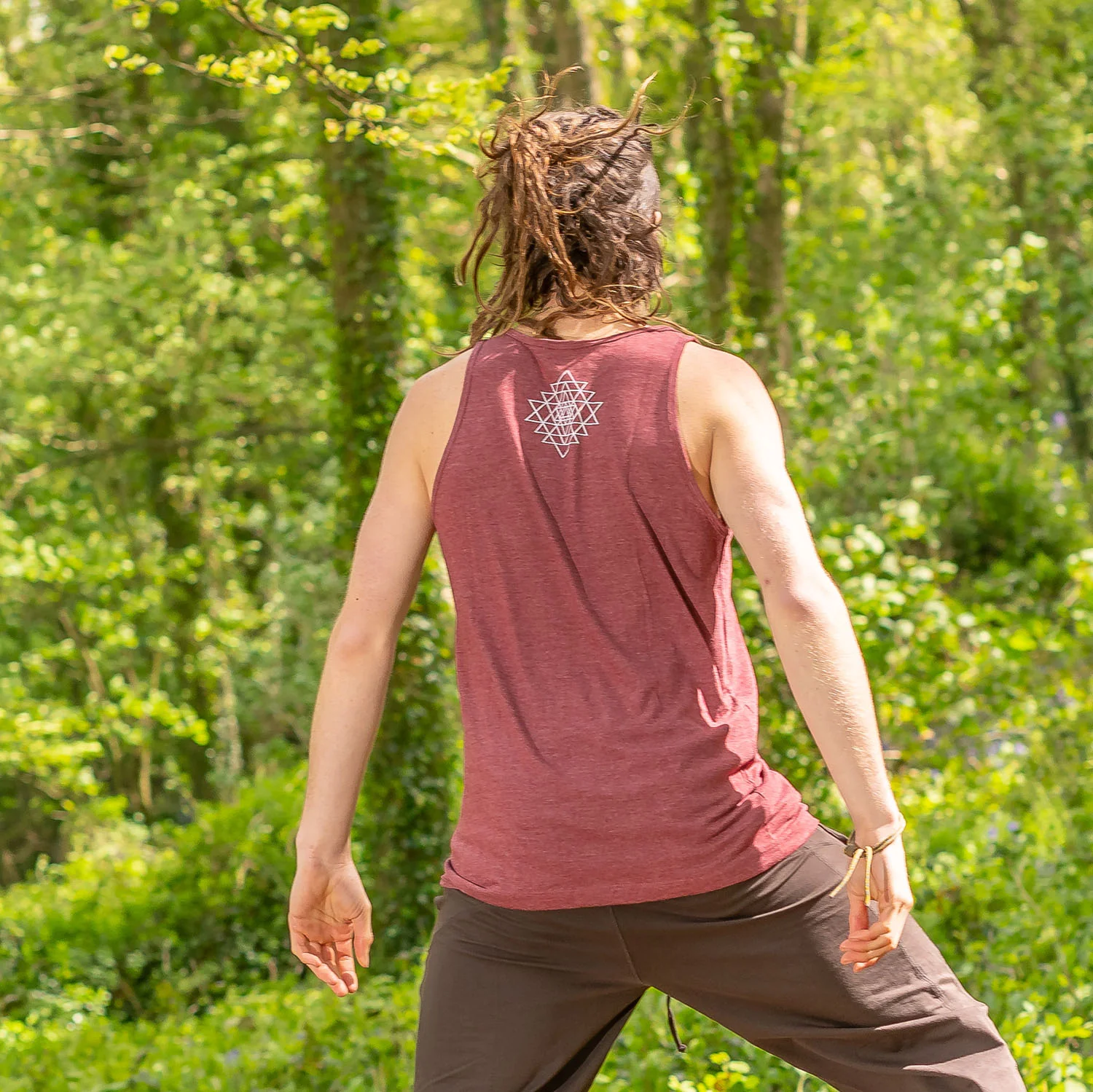 The Sri Yantra is printed large on the front and in a smaller version on the back just under the neck. The Sri Yantra is an ancient Vedic symbol of sacred geometry representing the union of masculine and feminine energy. The downward triangles represent the feminine and the upward triangles represent the masculine.