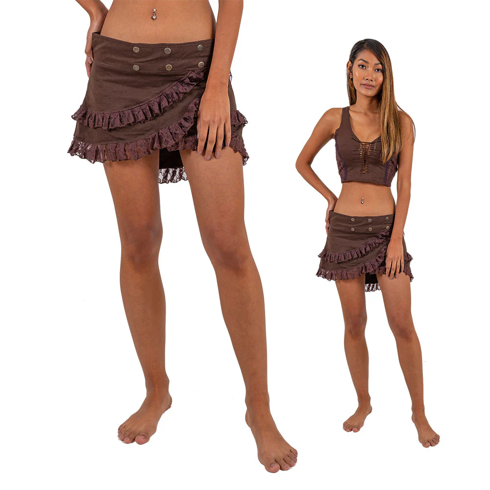 The perfect addition to any hippy festival outfit! Comfortable and stretchy, our Waterfall Pixie Skirt is a wrap around skirt secured with snap buttons. It has two lovely flowing layers with lace edging.