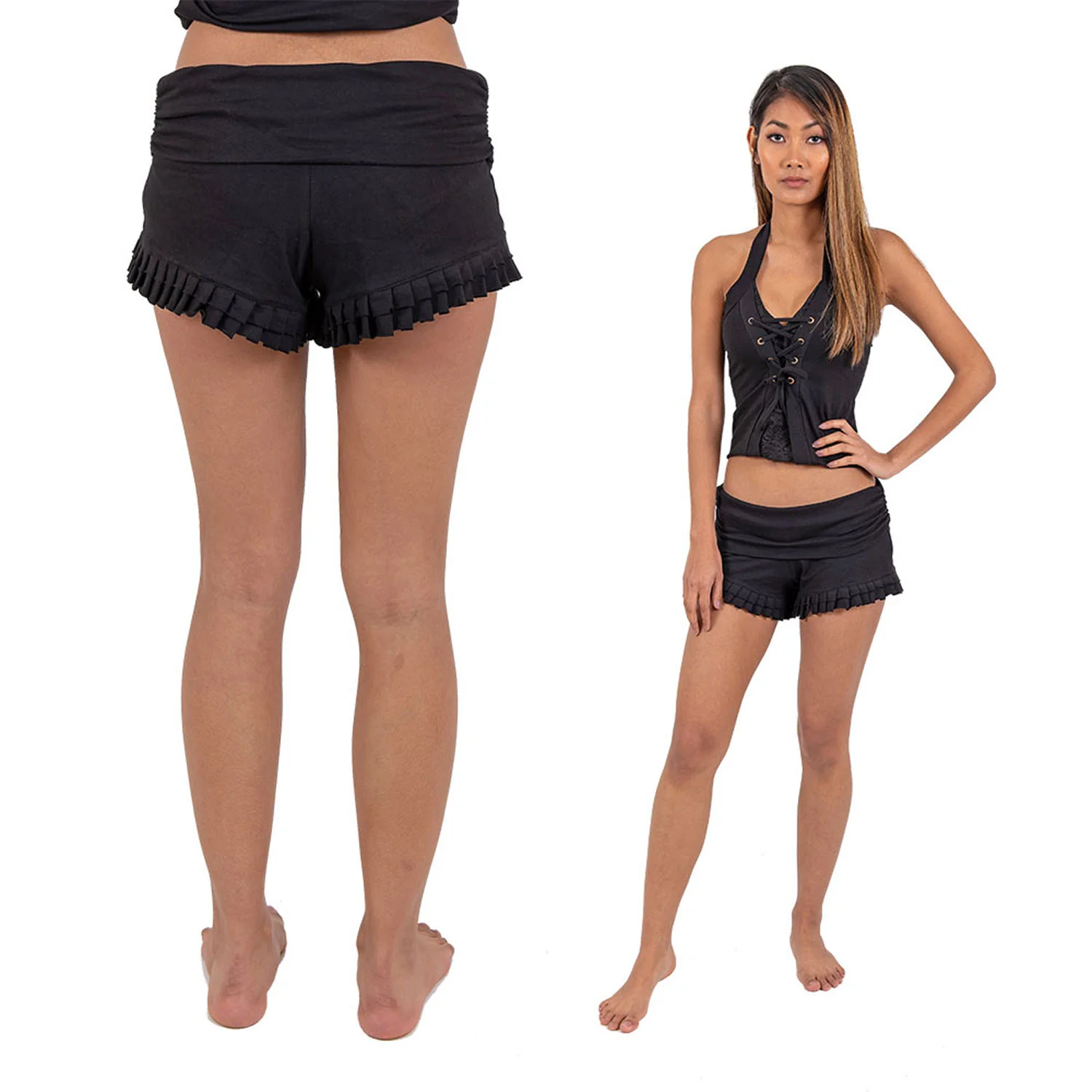 Comfortable stretchy shorts with a wide waist band and double ruffle detail on the bottom hem. The waist band is super supportive and is folded over double when the shorts are worn low rise.